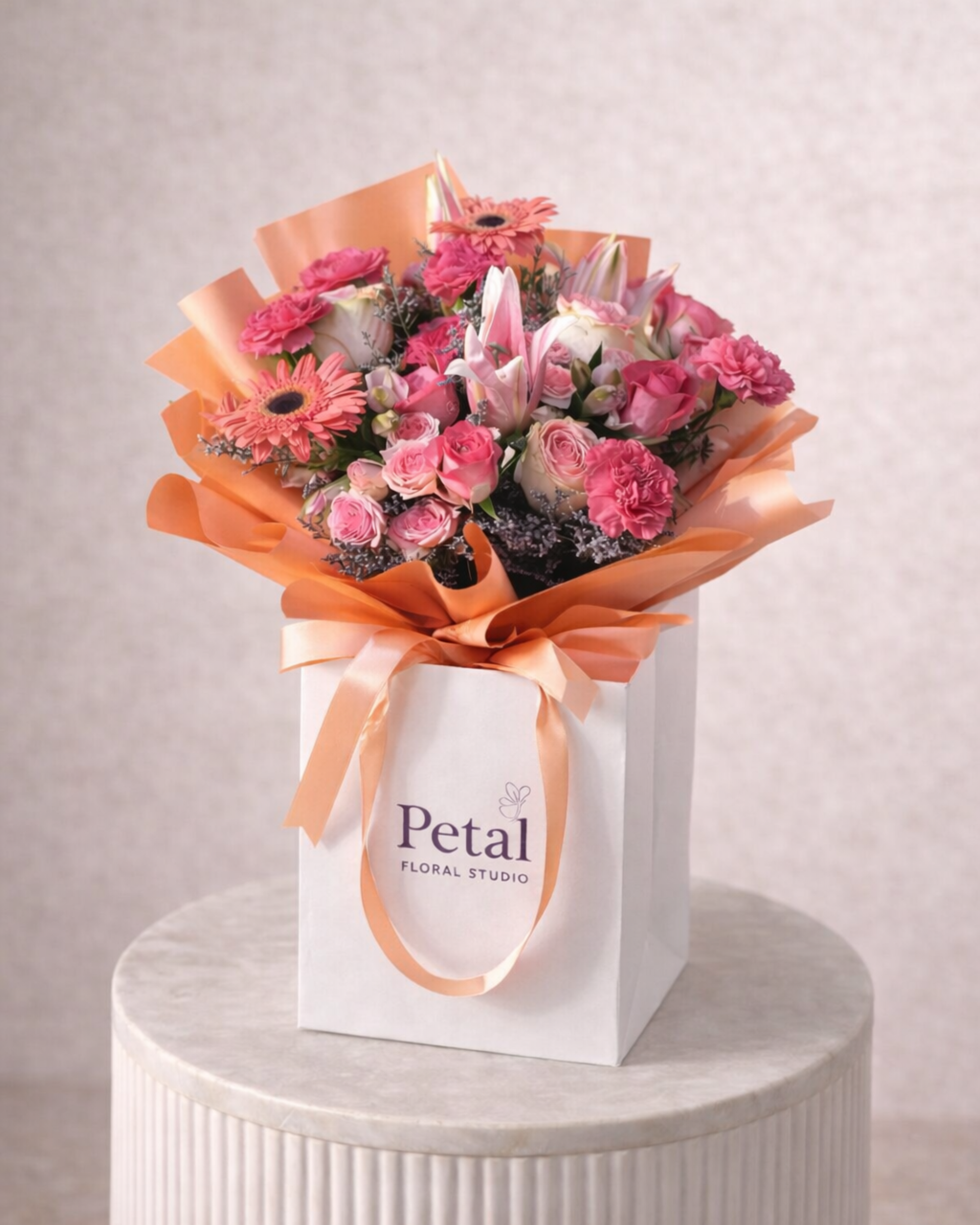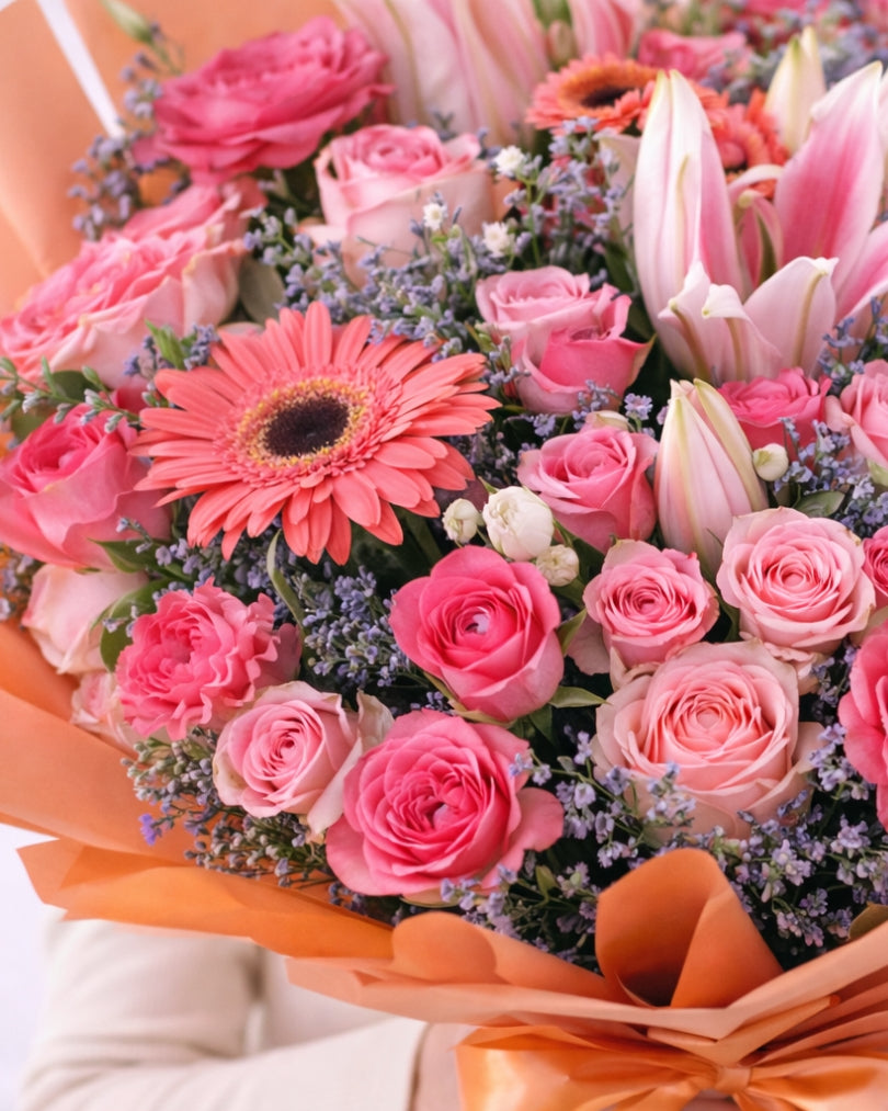 باقة أنيقة بتدرجات وردية وخوخية ناعمة، تعكس الدفء والرقي، ومثالية للإهداء في المناسبات الخاصة أو للتعبير عن مشاعر صادقة بأسلوب راقٍ.