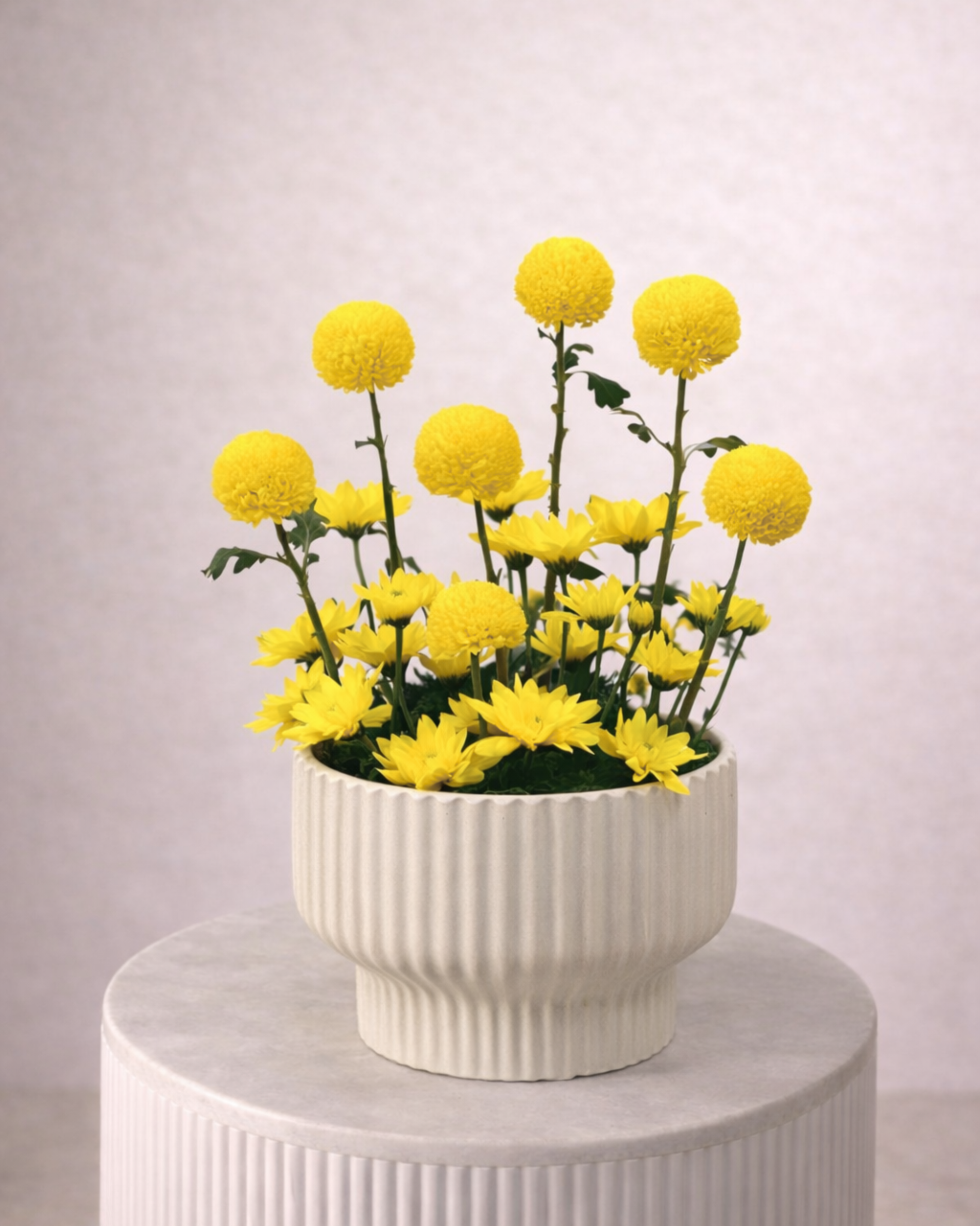 تنسيق مرح من الزهور الصفراء بتصميم بسيط ومشرق، مثالي لنشر الطاقة الإيجابية وإضفاء لمسة فرح على أي مناسبة.