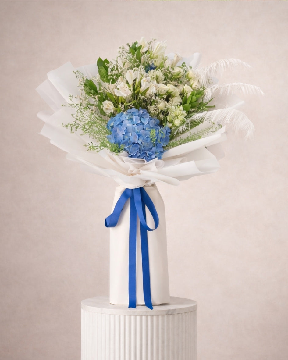 بوكيه أنيق يجمع بين الهدرانجيا الزرقاء والورود البيضاء بلمسة فاخرة وهادئة. اختيار مثالي للهدايا الراقية والمناسبات الخاصة، يعكس صفاء الذوق ويترك انطباعًا راقيًا يدوم.