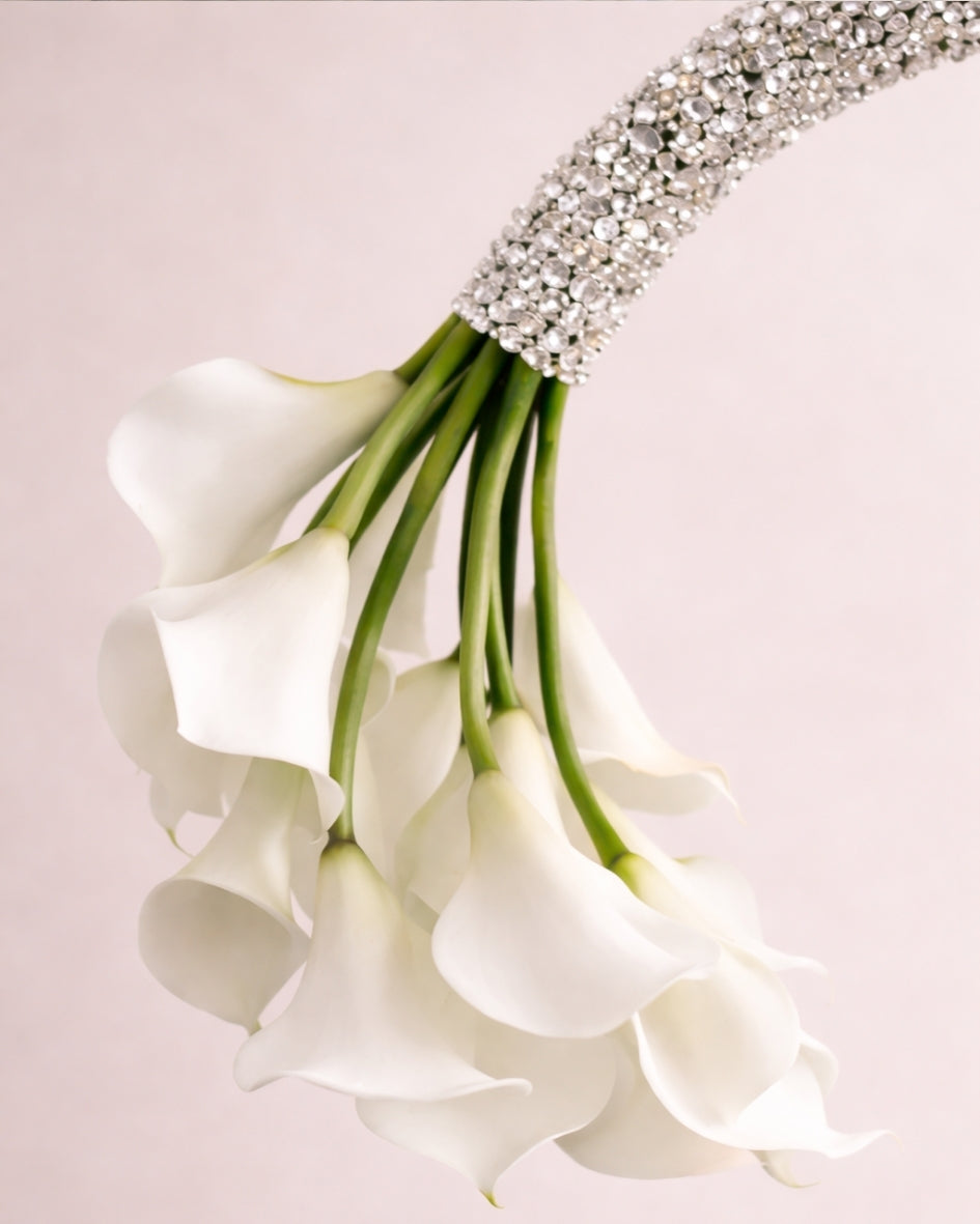 تصميم فاخر من زهور الكالا البيضاء بانسيابية أنيقة ولمسة كريستالية راقية. قطعة استثنائية تناسب المناسبات الفخمة والهدايا الراقية لمن يبحث عن التميز والذوق العالي.