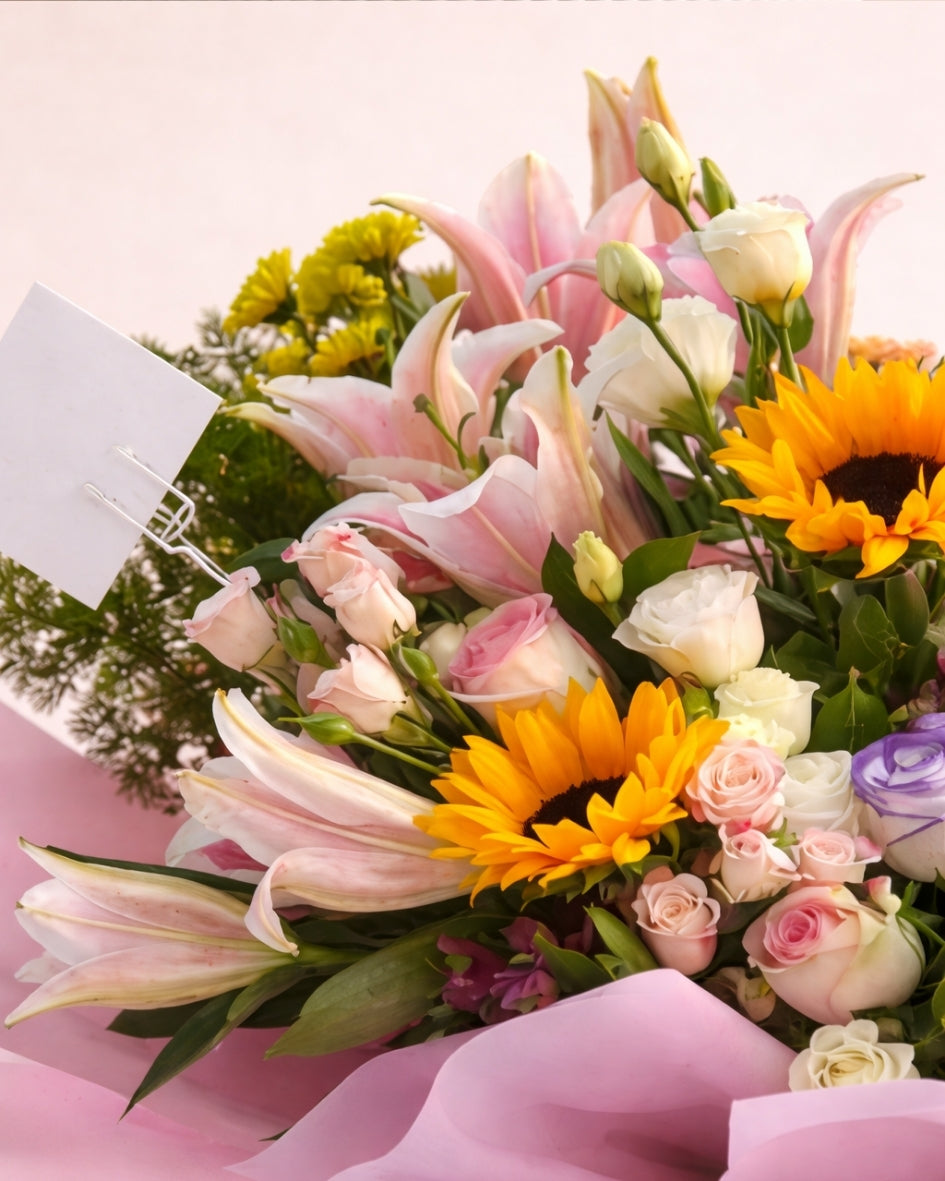 بوكيه غني ومبهج يجمع بين الزهور الوردية الناعمة ولمسات صفراء مشرقة، بتصميم حيوي مليء بالمشاعر. هدية مثالية للتعبير عن الفرح، الحب، والاهتمام في كل مناسبة خاصة.