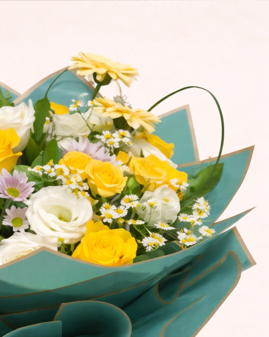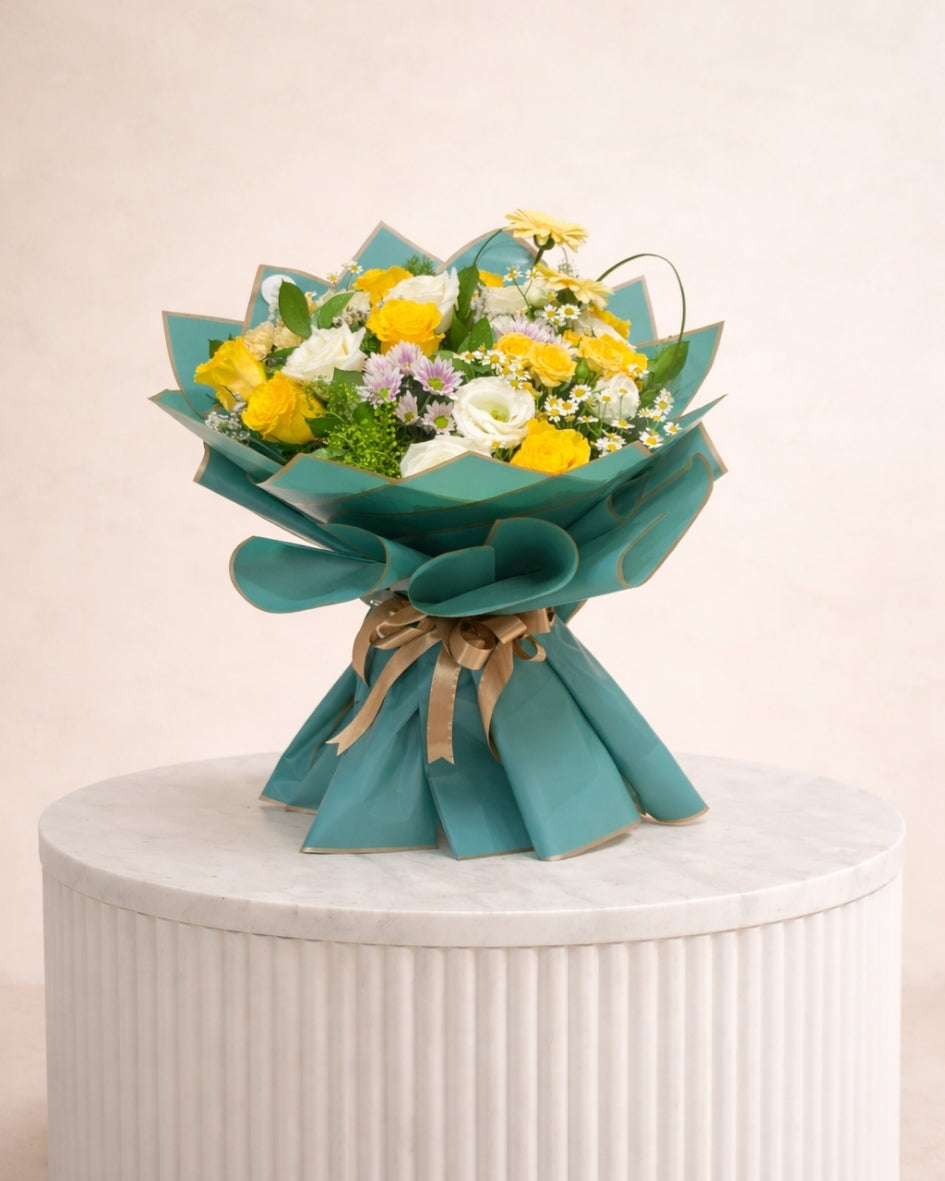 بوكيه نابض بالحياة يجمع بين الورود الصفراء والبيضاء بلمسة منعشة وتغليف أنيق. اختيار مثالي لإهداء مشاعر الفرح والطاقة الإيجابية في كل مناسبة، بتصميم يلفت النظر ويبهج القلب.